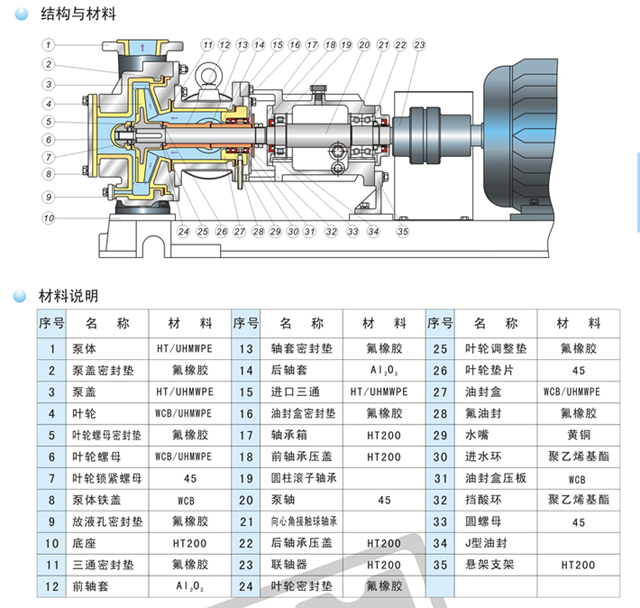 采用軸向進(jìn)口,徑向出口方式,葉輪采用半開(kāi)式、流道寬,在輸送含有顆粒的漿料時(shí)不易堵塞,抗結(jié)晶、耐顆粒。 |