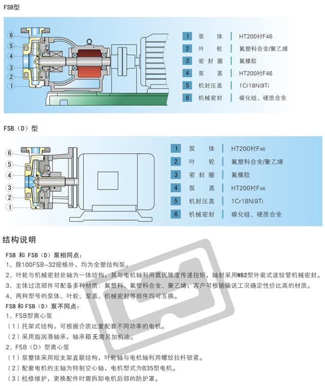 FSB和FSB-D型離心泵,過流部件全部采用氟塑料合金制造結(jié)構(gòu)緊湊、操作簡單、價(jià)格低廉。兩種型號(hào)的泵殼、葉輪、機(jī)封等均可互換使用,深受農(nóng)藥、電子、造紙等行業(yè)的歡迎。