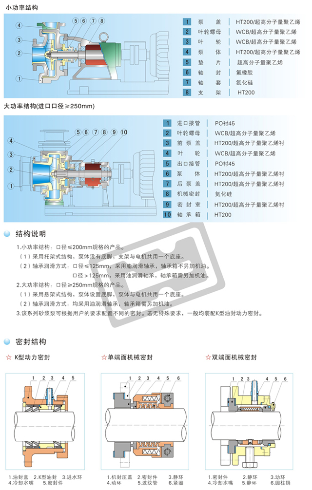 該系列泵采用多種密封方式:K型動(dòng)力密封、單端面機(jī)械密封和雙端面機(jī)械密封,可根據(jù)具體工況條件選用。
